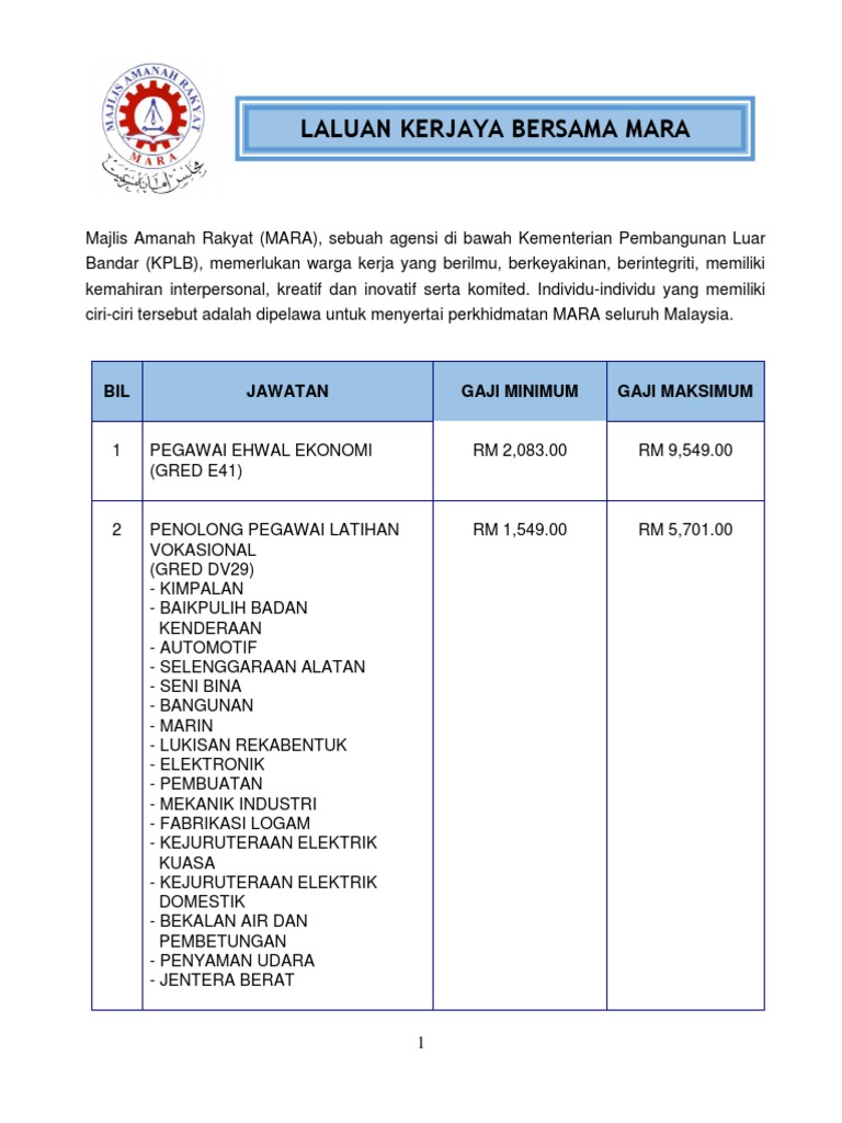 Laluan Kerjaya Bersama Mara Bil Jawatan Gaji Minimum Gaji Maksimum
