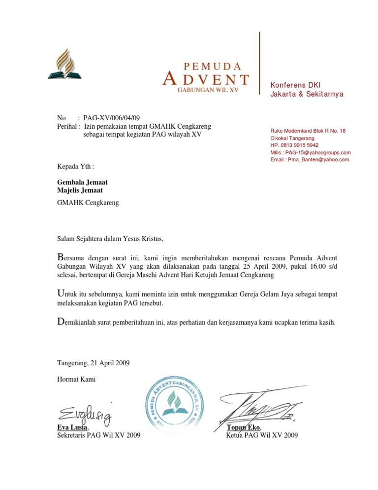 Surat Peminjaman Gereja Cengkareng Untuk Pag Wil Xv Tgl 25 Aprl 2009