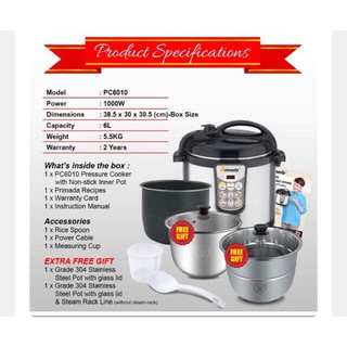 Primada 6 Liter Dual Pots Pressure Cooker Pc6010 1 Non Stick Pot Free 1 Stainless Steel Pot 1 Mini Rice Cooker Shopee Malaysia