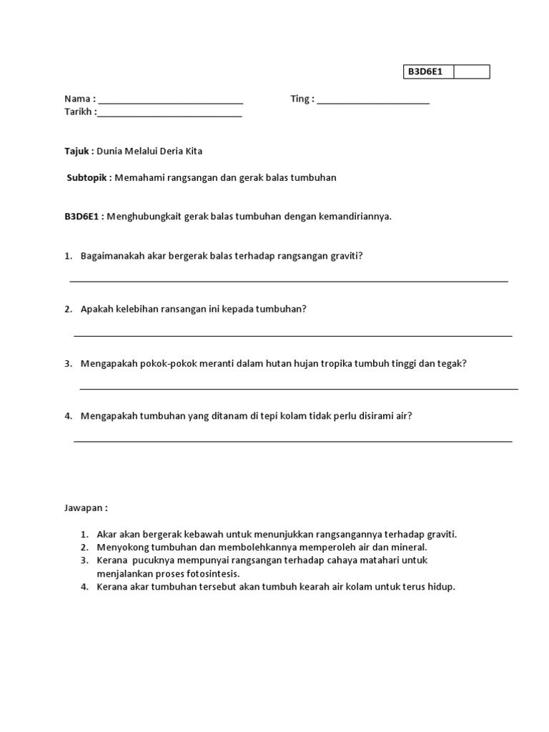Rangsangan Gerak Balas Tumbuhan Lessons Tes Teach
